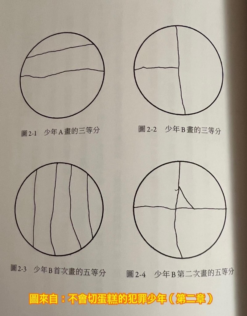 宮口很快就發現,非行少年不會切蛋糕,例如,一塊圓形的蛋糕「如何平分給三個人?」這時少年會陷入困境,切出非常不均分的三塊。正確答案應該是像賓士汽車的logo,但少年做不到。若平分給五個人呢?一樣也是很困難(如下圖示)。