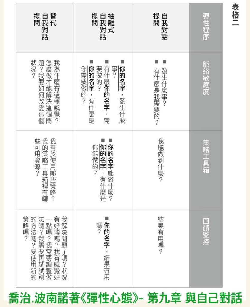 #作者的論述 採用前面幾個章節的「彈性心態」與「彈性程序」來自我對話;可以參考圖片的表格。